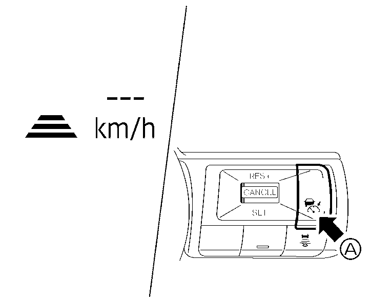 To turn on the cruise control, quickly push and release the Cruise ON/OFF switch (A). The ICC system ON indicator (grey), set distance indicator and set vehicle speed indicator come on and in a standby state for setting.