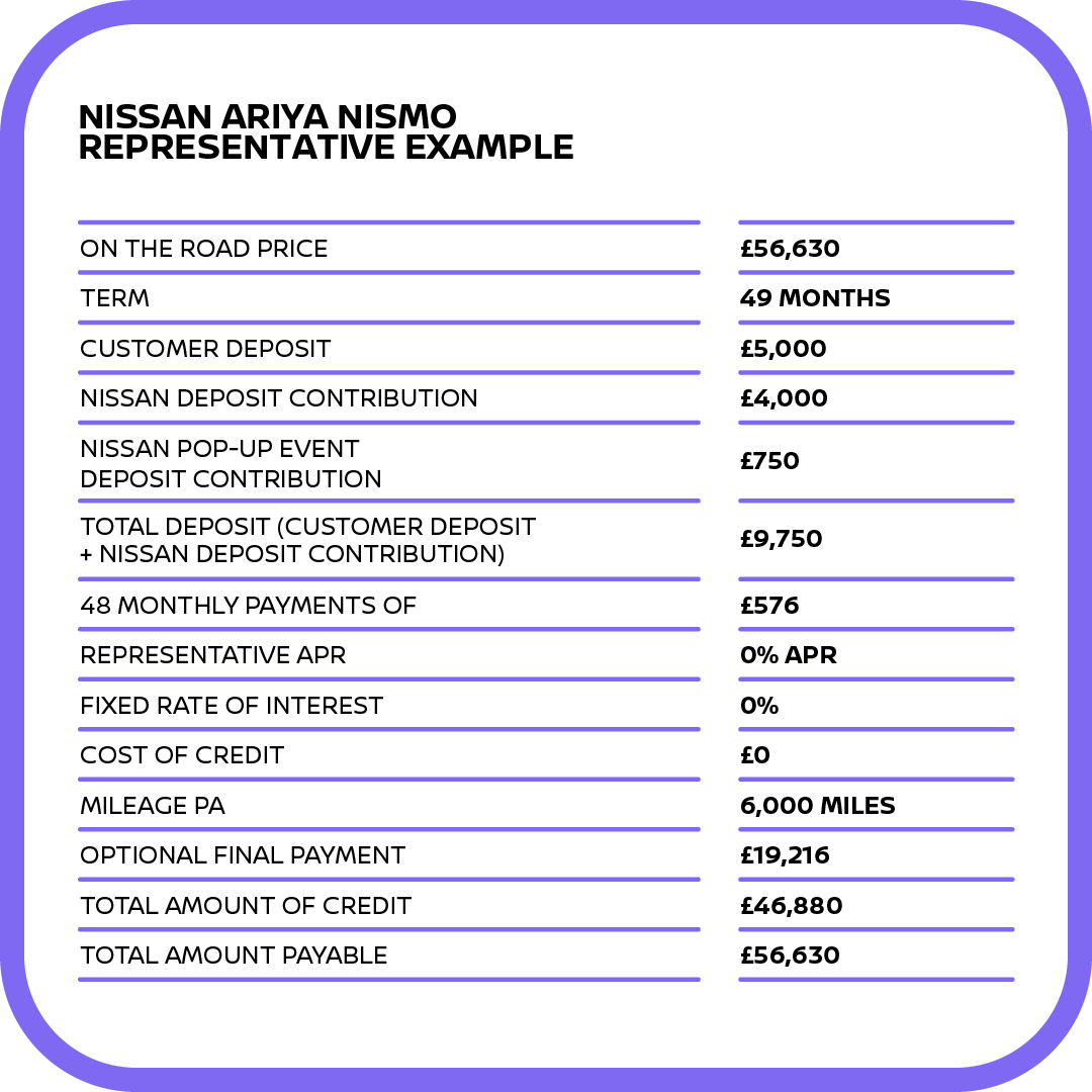10 Offer valid from 8th January 2026 until 9th February 2026 at participating dealers only and subject to vehicle availability. To be eligible, vehicles must be ordered by 9th February 2026 and registered by 31st March 2026. Finance provided by Nissan Financial Services, Rivers Office Park, Denham Way, Maple Cross, Rickmansworth, WD3 9YS. Subject to status. Guarantees and indemnities may be required. You must be at least 18 and a UK resident (excluding the Channel Islands). ADDITIONAL NISSAN DEPOSIT CONTRIBUTION OF £750 IS ONLY AVAILABLE WHEN TAKEN ON 24-36 MONTH 0% APR REPRESENTATIVE PCP NISSAN FINANCIAL SERVICES PRODUCT. Applies to: Qashqai (all models); Juke (except N-Sport); ARIYA (NISMO only); and X-Trail (except e-POWER grades; e-4ORCE (Acenta Premium, N-Connecta, N-Trek, Tekna, Tekna+) . 30% MINIMIUM DEPOSIT REQUIRED ON QASHQAI, X-TRAIL AND JUKE. ARIYA NISMO 0% APR REQUIRES 36-48 MONTH TERM. Offer based on 8,000 miles pa, excess mileage 8p per mile. Offers not available in conjunction with any schemes or other offers. Vehicle price includes first registration fee and 12 months’ road fund licence. Nissan reserves the right to amend or withdraw offers at any time without prior notice, including in the case of any events or circumstances beyond Nissan’s reasonable control. Terms and conditions apply. Please refer to your local authorised Nissan dealer for further information and exact specifications. Your Nissan dealer is a credit broker and not a lender and can introduce you to a limited number of lenders and their finance products. You must decide whether the finance product is right for you. Lenders will typically pay commission to your Nissan dealer, being either a fixed fee or a fixed percentage of the amount you borrow. Commission rates between lenders could vary, but the commission received by your Nissan dealer does not influence the interest rate you will pay.